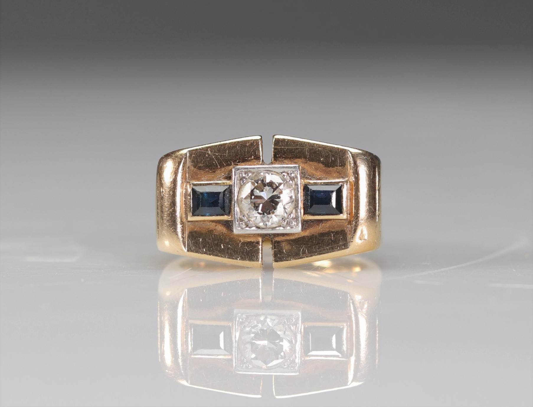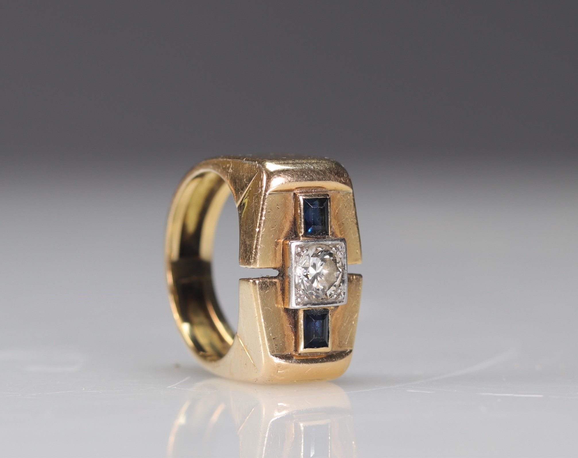 Bague chevalière Art Déco or 18k diamant 28p et saphirs (9.6gr)